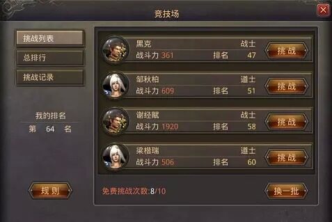 1.根据玩家的排名,系统会随机选出4名玩家,你可以选择与他们进行挑战,挑战胜利后,你的排名将会上升;若挑战失败,排名将保持不变。