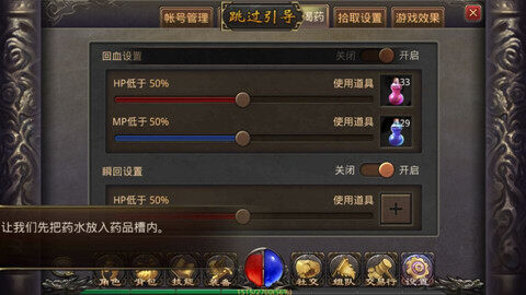 血瓶建议设置为30% 进行补充,而蓝瓶为40% ,减少道具消耗几率保证战斗的持续。