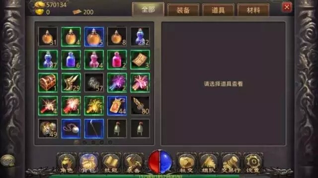 背包:打开背包按键可查看背包详情,以及装备,道具,材料等分类情况。