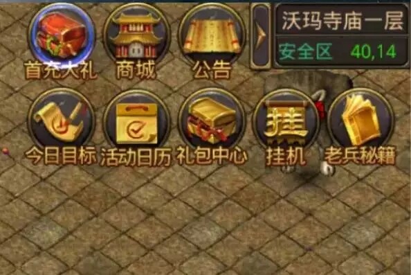 右上角区域键位功能,可以在游戏界面右上角箭头区域展开显示,再次点击则隐藏功能显示区域。右上角按键区域包括:地图,首充大礼,商城,公告,今日目标,活动日历,礼包中心,挂机,老兵秘籍。