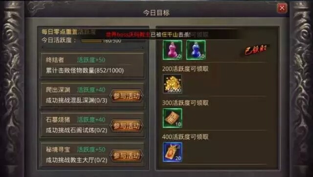 今日目标:今日目标按键功能,可以查看每日零点重置活跃度,查看当前可需要完成的任务。