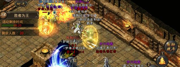 胜者为王这个活动每天开启两次,分别在15点和21点,但每位玩家每天只能参加一次,进入后系统会随机将玩家分入两个阵营,然后根据玩家的职业来给予一个强力加血量上限的buff,战士+100000,法师+50000,道士+65000,活动开始5分钟后根据积分的高低再进行一次阵营的更换,避免积分低的阵营一直被屠杀,7分钟后地图的周围开始出现火墙,火墙的范围会逐渐增大,意味着玩家们可活动的区域会慢慢的减小,每次进入火墙都会减掉最大生命值的30%。同时在地图的四个角上会按规律的刷新加各种buff的道具,人物触碰到就可以生效了。