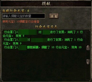 3、捐献“行会元宝”1)所有行会成员可进入行会界面,点击“捐献”按钮为“行会元宝”进行充值。捐献兑换比例:每1元宝=10行会元宝