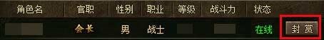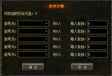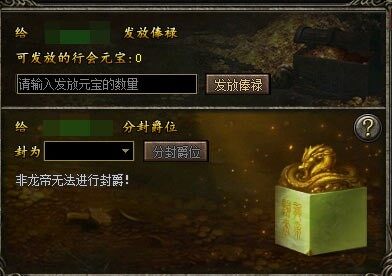 4、赏赐“行会元宝”:只有行会会长/副会长拥有分配“行会元宝”的权力,可对选中的行会成员点击“封赏”:进入行会元宝分配界面:(如下图所示)