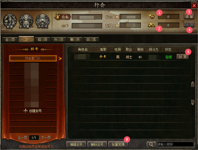 标注①行会元宝储备:行会公共财产。标注②个人拥有的行会元宝:分配给个人的“行会元宝”标注③捐献:可增加行会元宝储备标注④领赏:可领取个人行会元宝标注⑤封赏:行会会长/副会长可对行会成员“分封爵位”和“发放俸禄”。龙帝才能使用“封爵”功能。标注⑥批量封赏:可对同封号的行会成员,批量发放俸禄。