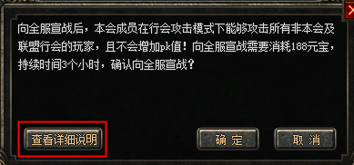 向全服宣战后,本会成员在“行会攻击模式”下能够攻击所有非本会及联盟行会的玩家,且不会增加pk值!向全服宣战需要消耗188元宝,持续时间3个小时。全服宣战后的pk值规则可在游戏中点击【查看详细说明】查看。