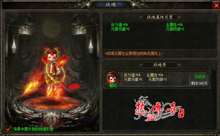 2.【哪吒】售价:128元宝有效期:自激活起365天3.“战魂”可实时跟随角色,虽不可攻击、不可被攻击,但会在有效期内提供持续的属性加成。4.特效展示: