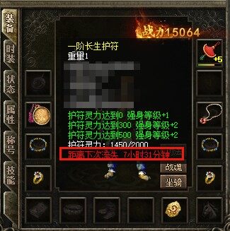 六、护符合成:一阶长生护符可以合成二阶长生护符。合成公式:2个一阶长生护符+1个护符升级石=二阶长生护符