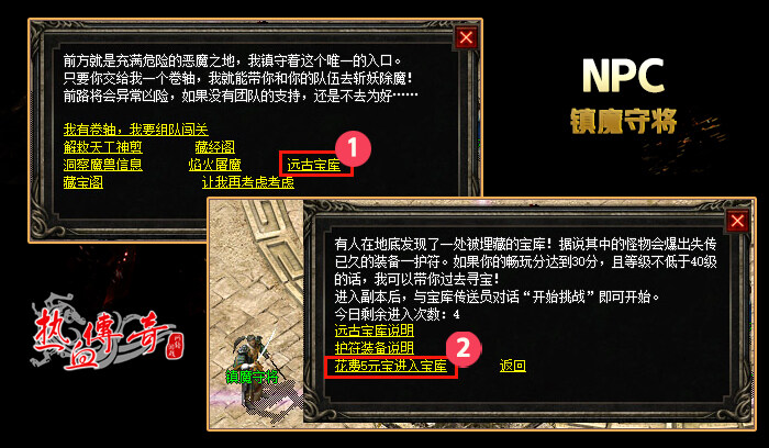 活动NPC:镇魔守将注:角色在地图内死亡或大退将会回到盟重,需重新购票进入。