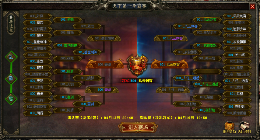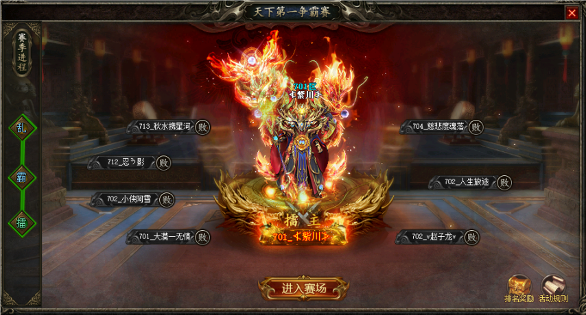 心法区冠军:(获得“争霸赛天下第一”称号)701区 ≮紫川≯801区 风云刺客