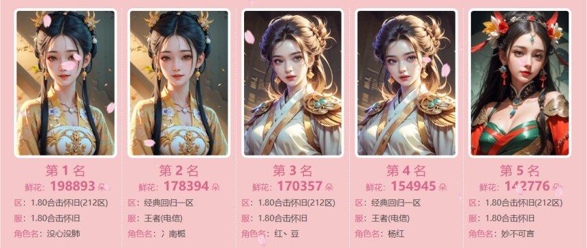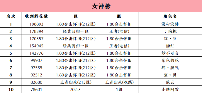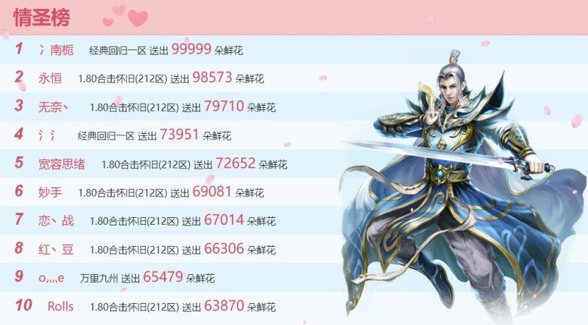 520,是个温柔的日子,玛法大陆弥漫着爱的气息与心跳的节奏。2025年520特别活动“十大女神”与“十大情圣”榜单终于揭晓。在这个充满真挚情感的时刻,勇敢表白的勇士们书写了属于他们的浪漫篇章。每一个名字,都是一次真心的告白;每一朵鲜花,都是无数甜蜜时光的见证。让我们一起见证这一刻,让爱与勇气在520这一天永远绽放。【十大女神 名单出炉】经过一番激烈的角逐,十位魅力女性角色脱颖而出,荣获“十大女神”的殊荣,她们以各自独特的风采和不凡的实力,赢得了大家的青睐和鲜花。【十大情圣 名单出炉】与此同时,“十大情圣”名单也火热出炉,鲜花承载了他们的深情厚意,成就了十大女神,也成就了自己的荣耀。