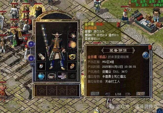如上图所示,这个金手镯也是攻4的属性,不过还多了1点道术属性很可惜,都加在攻击属性上面那就炸裂了。值得一提的是这个攻4道1金手镯也产自封魔谷的半兽勇士,打怪玩家的名字也很有特色,叫“天命打工人”,这运气也是没谁了。