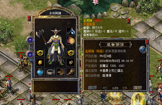 金手镯是复古版本中战士的热门穿搭之一,尤其是加点的高攻金手镯价值连城。目前新百区有一个攻5金手镯,若干攻4金手镯,比较稀罕。如上图所示,这个攻4金手镯就产自封魔谷的半兽勇士,果然是非一般的产出啊。