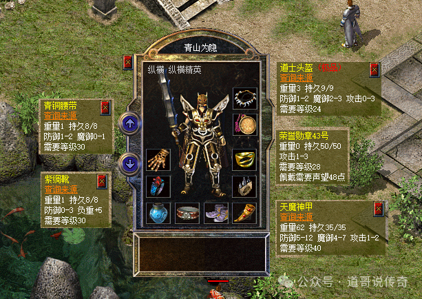 再来看看服饰系列,这五件套档次真不低,都是现阶段新百区的巅峰系列。攻3道士头盔是大佬追捧的热门自然不必多说,1-3荣誉勋章和天魔神甲本身就是顶配,还有青铜腰带和紫绸靴同样是现阶段的最高端系列,如此穿搭的确符合大佬玩家的身份。