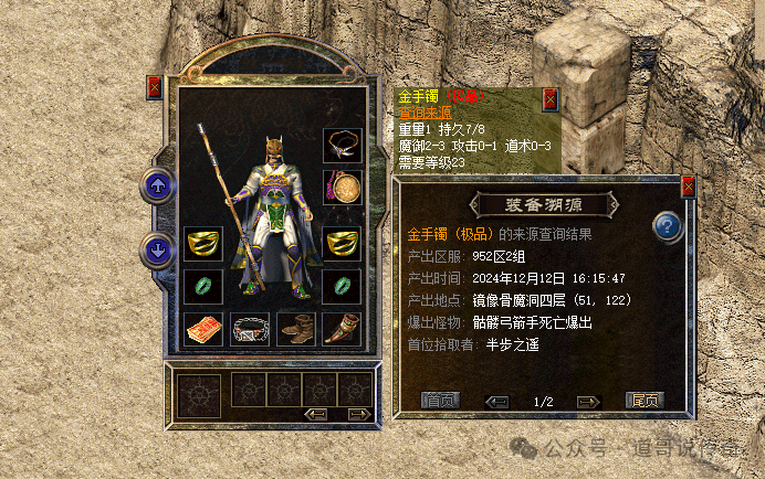 金手镯自带属性强悍,只要能加三职业属性点就很牛掰,如上图所示,这个金手镯多加了3点道术属性,虽说没有加攻击热门,但是对于道士玩家而言去赤月和团战的时候都是攻防一体的存在。这个道3金手镯产自骷髅弓箭手,这收获还是很棒的。