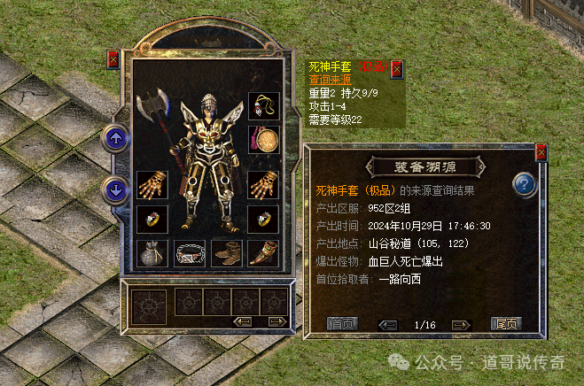 现阶段新百区的攻4死神手套是运九套或者运十套战士的热门首饰选择,十分抢手,毕竟攻4金手镯还是比较稀有的。如上图所示,这个攻4死神手套产自山谷密道的血巨人,这个地方老道以前去过不少次,确实是打宝的好地方,只不过老道没产出过啥好东西,可能打怪太少了吧。