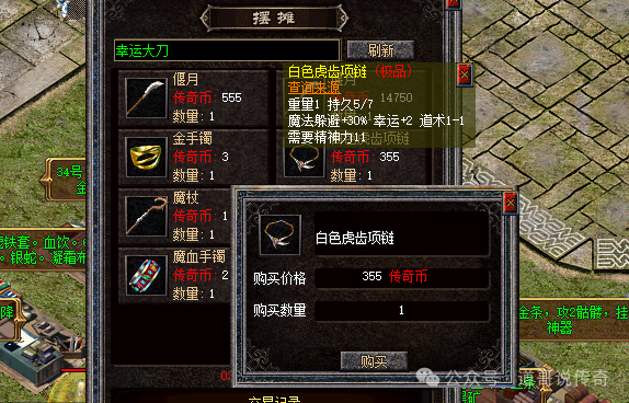 同样是2点幸运的基础上多加1点属性,但是上图中的这根白色虎齿项链就摆摊355了,主要是它的1点属性加在了魔法躲避上面,在保证刀刀上限的情况下能有更多的魔法躲避自然更好,而且是三职业通用,它贵一些也是可以理解的。