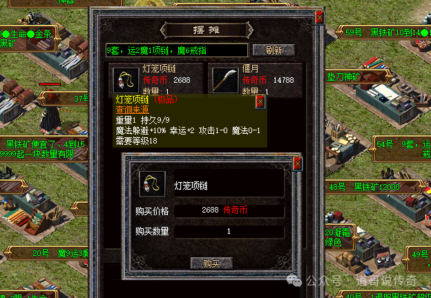 前面都是白色虎齿项链,而上图中来了一根灯笼项链,它加了2点魔法属性和1点魔法属性,同样是加了3点属性,但是它摆摊2688。目前新百区的战法职业是最热门的,在运2链子基础上也就战士有一根攻2灯笼,价值不可估量,而法师运2项链最多也就1点魔法属性加持,因此这根运2魔1灯笼项链才能放出2000+的数字,确实厉害。