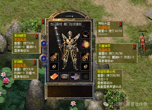 看见青铜腰带和紫绸靴之后,老道就知道这位战士的服饰系列必须是巅峰级别。除了现阶段新百区最高端的腰带和靴子以外,天魔神甲和43号荣誉勋章是巅峰级别,至于神秘头盔肯定也是高攻属性的加点,起码不会低于3点攻击属性上限。这五件套堪称攻防一体,确实牛掰。