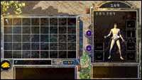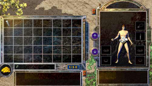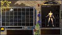 左边就是包裹窗口(F9), 右边是角色装配窗口(F10). 在这里你也许可以看见你强壮的肌肉,不过在这种装配条件下,你是干不了什么的. |
