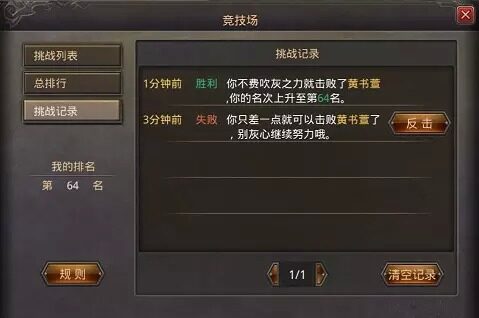 5.你可以通过翻看【挑战纪录】查阅与你相关的竞技场PK纪录,包括你挑战别人的,和别人挑战你的。