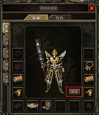 打开人物界面,点击英雄右下角的“炼体”按钮,即可进入“炼体”修行。
