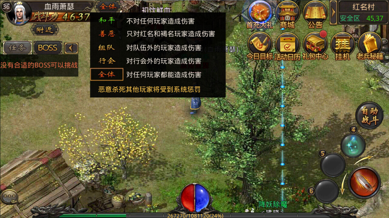 看上图在ID右侧是可以选择的,如果选择和平是不可以发生pk的,而如果选择了全体,再站到pk区打开自动战斗那可就是见谁打谁了,建议如果不对自己的战斗力抱有充分信心还是别这么干的好。