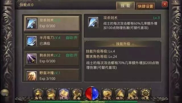 技能:技能按键可查看技能和设置技能快捷键。