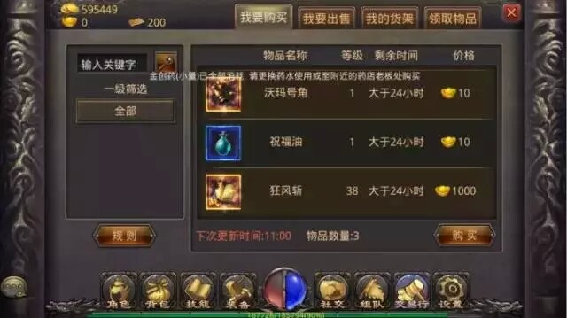 交易行:交易行按键功能,可进入交易行,通过我要购买,我要出手,我的货架,领取物品来完成交易。