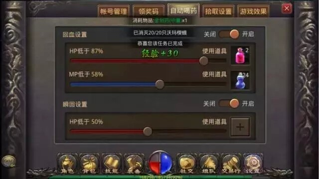 设置:设置按键功能,可针对帐号管理,领奖码,自动喝药,拾取设置,游戏效果等功能完成设置。
