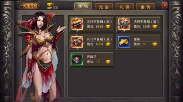 商城:商城按键功能,可在商城购买商城物品,分别有热销,元宝,礼卷,坐骑区域。