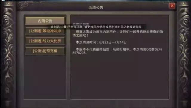 公告:公告按键功能,可查看近期官方公告,以及相关的活动内容。