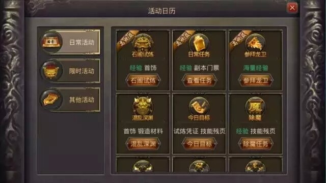 活动日历:活动日历按键功能,可查看日常活动,限时活动,其他活动,并迅速进入相关活动区域。