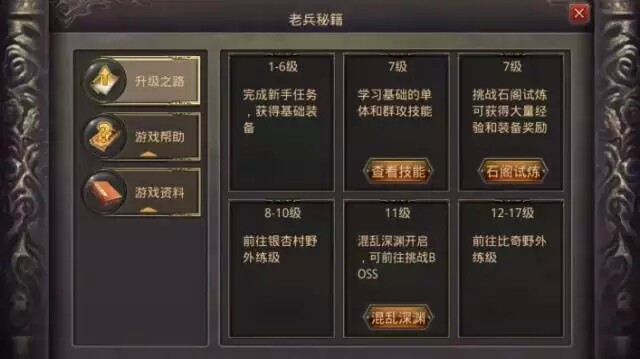 老兵秘籍:查看游戏升级之路,游戏帮助,游戏资料等,快速掌握和了解游戏动向和内容。