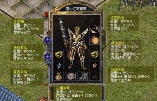 江南至尊的穿搭装备在百区中的地位。江南至尊的装备可以说是一人之下万人之上,比如攻击值达到9的圣战戒指和攻击值为3的天魔神甲等,仅次于难得糊涂的装备。而且不少极品装备的属性与江南至尊的装备相同,例如攻击值为6的金手镯一对、运气值为2、攻击值为5的记忆项链,以及攻击值为38+7的裁决之杖等。江南至尊的穿搭与难得糊涂的穿搭只有微小的差距,在百区中也同样是备受瞩目的存在。
