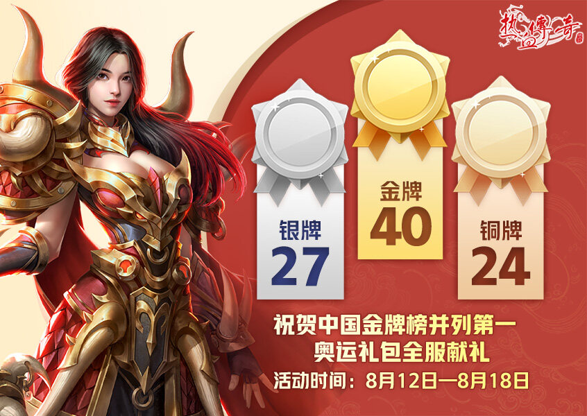 《热血传奇》为中国骄傲!在刚刚落幕的“2024巴黎奥运会”中,中国体育代表团以40金27银24铜的成绩圆满收官,创下境外奥运会金牌数最多的纪录,金牌总数并列第一!