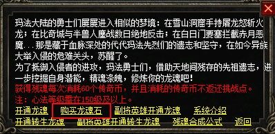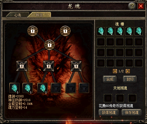每当夜幕降临,星辰璀璨之时,玛法大陆总会有一股神秘的力量在古老遗迹中悄然涌动。传说中的龙魂,作为勇士们追求的至高境界,一直是所有人心中的梦想。如今,随着一股未知力量的觉醒,龙魂修炼终于迎来了新的篇章——达到转生120级的勇士,可在募兵统领处选择“开通转生龙魂”,从而解锁这条通往更强者的道路。龙魂的光芒将指引着每一位勇者,穿越重重困难,最终达到无人能及的高度。更新区服:1-175区(除167、168)更新时间:即日起一、如何开启转生龙魂修炼:1、想要修炼的勇士,需要达到转生120级后可以在盟重NPC募兵统领处选择“开通转生龙魂”,免费解锁第一层6个龙魂槽!2、打开人物面板,“龙魂”修炼新增“转生”修炼:二、如何进阶转生龙魂修炼:1、转生龙魂修炼和龙魂修炼玩法相同,但是值得注意的是:残魂不通用。2、点击“龙魂”进入可进行:获得残魂;合成残魂;封印残魂;嵌入残魂等操作,进而激活潜能进修残魂,达到对自身实力的全面提高。3、如何获得残魂:使用传奇币可抽取1级普通残魂或者1级技能残魂;天地残魂共有7种属性的对应残魂:防御残魂(魂御+神圣防御)、血量免伤魂(魔血值+魂力免伤)、坚韧残魂(全能坚韧+魂力坚韧)、韧性残魂(韧性+魂力韧性)、魂力攻残魂、魂力暴击魂、魂力暴伤魂另外有概率获得:技能残魂点击“获得残魂”每次抽取可随机获得3个残魂,如果满意,点击“保存残魂”;如果不满意继续点击“获得残魂”;面板中有20个魂槽区,抽取获得的残魂可保留到魂槽内,不可放入背包。相同的普通属性残魂*2可以合成高一级的普通属性残魂(一共10级)。4、合成残魂:1级普通残魂*2=2级普通残魂2级普通残魂*2=3级普通残魂3级普通残魂*2=4级普通残魂4级普通残魂*2=5级普通残魂5级普通残魂*2+转生龙魂石*10=6级普通残魂6级普通残魂*2+转生龙魂石*30=7级普通残魂7级普通残魂*2+转生龙魂石*60=8级普通残魂8级普通残魂*2+转生龙魂石*100=9级普通残魂9级普通残魂*2+转生龙魂石*200=10级普通残魂1级专属技能残魂*2 =2级专属技能残魂2级专属技能残魂*2 =3级专属技能残魂三、如何获得“转生龙魂石”:龙魂石,是当年神龙涅槃后留下的魂魄,蕴藏着非常强大的攻击力和神秘的元素力量!在盟重NPC募兵统领处,先选择“购买龙魂石”: