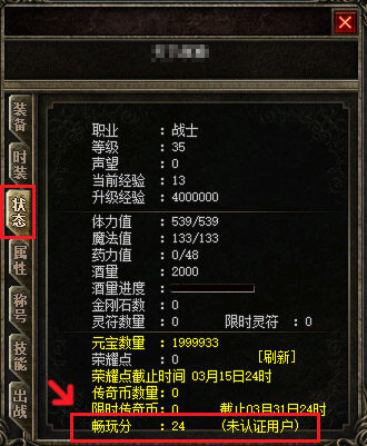 参与以下游戏内活动,即可轻松累积畅玩分!友情提示:畅玩分程序12月27日正式更新上线,畅玩分累积也将从12月27日起开始计算,敬请周知。1、在游戏中每消耗1元宝或传奇币计1分(不包括使用元宝兑换传奇币)。2、参与地下夺宝,与七层的NPC进行对话计1分(每天一次)。3、可使用畅玩分凭证至道具回收商处兑换,来增加畅玩分。畅玩分,可点开个人信息—状态页签查询。