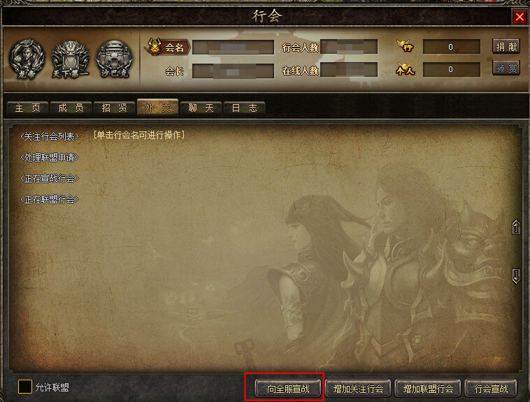 【向全服宣战】使用权限: 仅会长/副会长可开启注:向全服宣战功能当前仅能在龙帝央服开启并生效。且全服宣战状态不会带回本服!