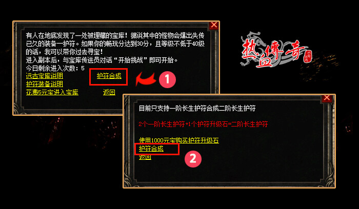 六、护符合成:一阶长生护符可以合成二阶长生护符。合成公式:2个一阶长生护符+1个护符升级石=二阶长生护符