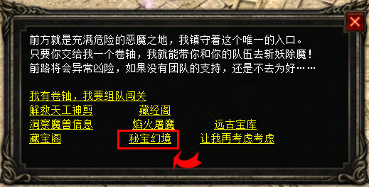 (二)秘宝幻境,四大地图可选择任一地图进入:雪原幻境、古墓幻境、桃源幻境、洞窟幻境(四张地图仅有地形差异)