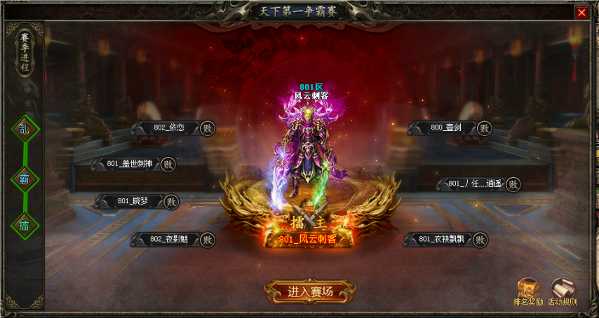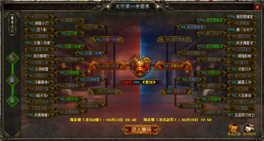 心法区冠军:(获得“争霸赛天下第一”称号)701区 ≮紫川≯801区 风云刺客