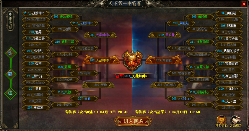自2025年3月29日开启的“天下第一争霸赛”跨服决赛,终于在今晚迎来了巅峰对决,经过一晚的激烈角逐,四大赛区的“天下第一”名单荣耀出炉!今晚各赛区八强选手向冠军宝座发起了最后的冲击,而最终胜出的选手,披荆斩棘赢得“天下第一”这一至高称号。