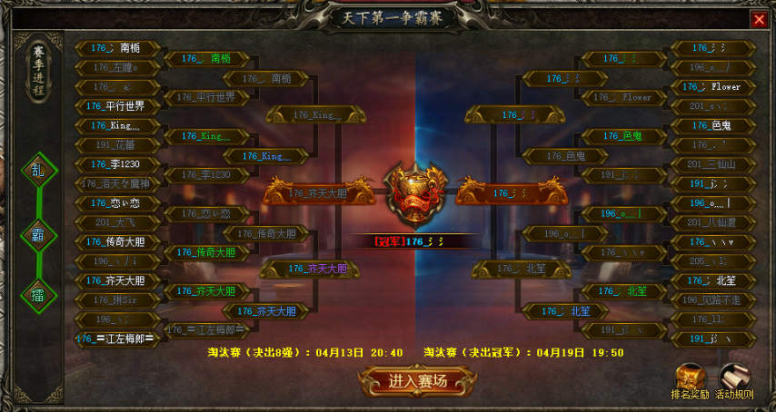 今晚四大战区“天下第一”获胜选手的精彩表现,无疑让他们成为了今夜最瞩目的存在。经典区冠军:(获得“争霸赛天下第一”称号)176区 氵氵207区 无敌帅帅冫