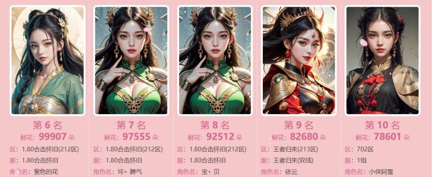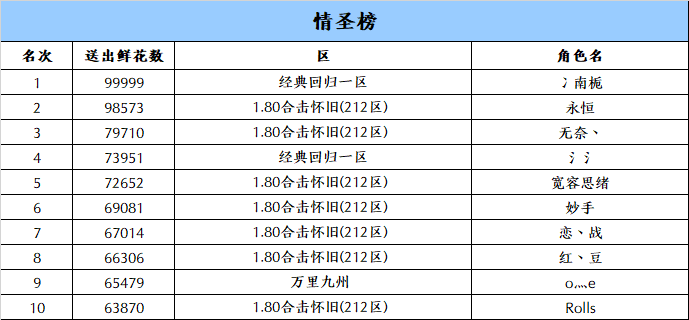 520,是个温柔的日子,玛法大陆弥漫着爱的气息与心跳的节奏。2025年520特别活动“十大女神”与“十大情圣”榜单终于揭晓。在这个充满真挚情感的时刻,勇敢表白的勇士们书写了属于他们的浪漫篇章。每一个名字,都是一次真心的告白;每一朵鲜花,都是无数甜蜜时光的见证。让我们一起见证这一刻,让爱与勇气在520这一天永远绽放。【十大女神 名单出炉】经过一番激烈的角逐,十位魅力女性角色脱颖而出,荣获“十大女神”的殊荣,她们以各自独特的风采和不凡的实力,赢得了大家的青睐和鲜花。【十大情圣 名单出炉】与此同时,“十大情圣”名单也火热出炉,鲜花承载了他们的深情厚意,成就了十大女神,也成就了自己的荣耀。