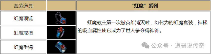 从名字可以看出虹魔戒指和虹魔教主脱不了干系,它确实来源于虹魔教主。当年玛法大陆的三英雄去封魔谷挑战虹魔教主,在历经千辛之后终于成功消灭虹魔教主,而它在亖亡之时用精血幻化出来一套装备,分别是项链,手镯和戒指,这也是玛法大陆上从未见过的存在。当人们佩戴这三件套之后发现在攻击目标的时候居然有微小的吸雪效果,果然厉害。