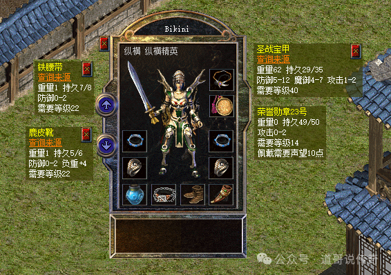 这位女战的服装系列搭配也算是中高档系列了,圣战宝甲目前摆摊也得大几百一件,攻2荣誉勋章是次顶级系列。铁腰带和鹿皮靴也是沃玛级别的档次,现阶段同样是次顶级装备。综合来看,这四件套已经属于大战士级别的搭配了。