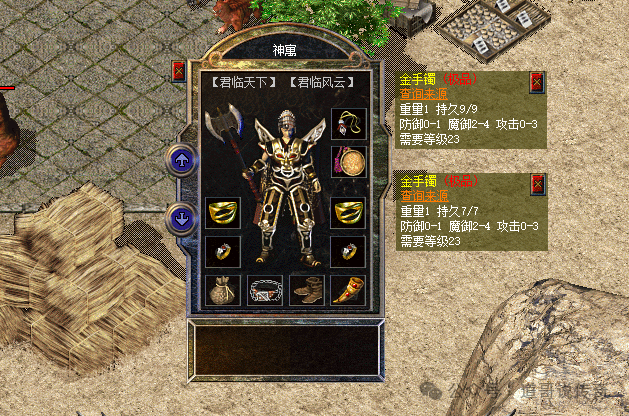 这位战士的一对金手镯属性还是比较特别的,如上图所示,它们都多加了1点防御属性上限,1点魔御属性上限和2点攻击属性上限,是攻防一体的稀有神镯,整体属性真不赖。值得一提的是其中一个还有9点持久上限,很适合战士玩家。