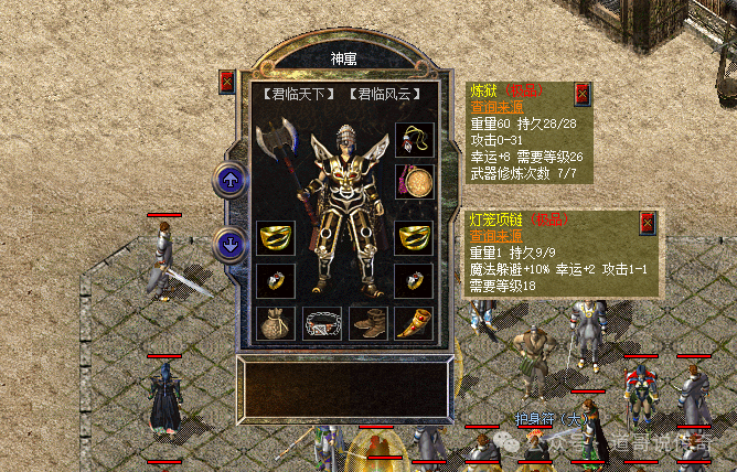 如上图所示,这把炼狱升级了6点攻击属性上限,而且还加了8点幸运值,普通的裁决都不够看的。这把炼狱搭配了一根运2攻1的灯笼项链,这也是很贵重的高端幸运链。这运10套搭配有了32点攻击属性上限,输出大头和刀刀上限有保证了。