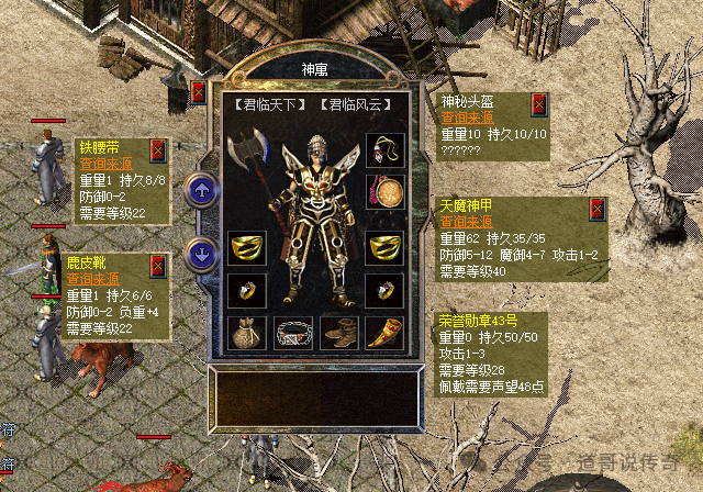 铁腰带和鹿皮靴是很多大战士的标配系列,毕竟紫绸靴和青铜腰带极少。天魔神甲和荣誉勋章43号是战士巅峰系列。又是神秘头盔加持看不见属性,不过分析来看这应该是主高攻属性,起码是3点攻击起步的那种。